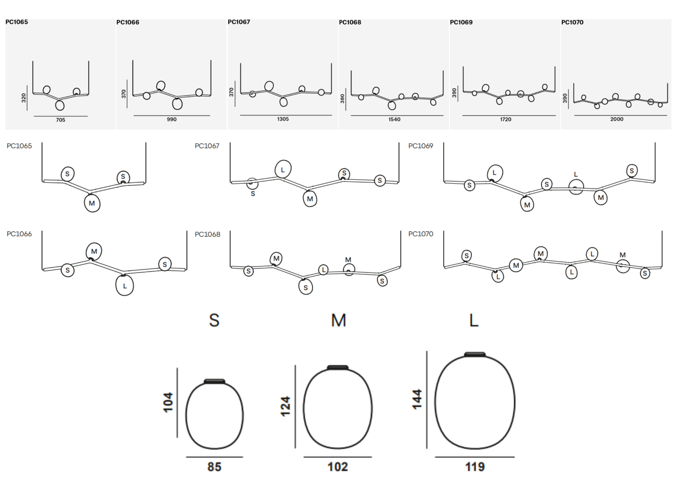 Abmessungen von Farbtönen (S / m / l)