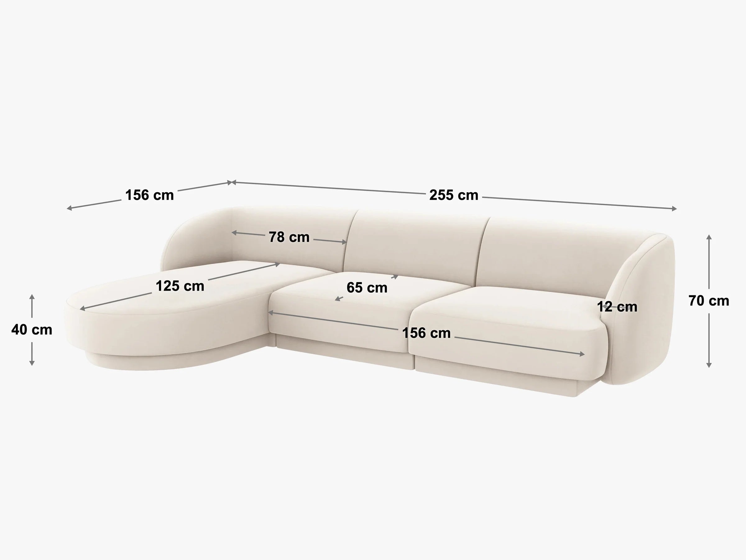 Ecksofa für vier Personen aus der Kollektion Miley bezaubert mit ihren abgerundeten Formen, die perfekt in die neuesten Einrichtungstrends passen. Neben der einzigartigen und minimalistischen Form zeichnen sie sich durch außergewöhnlichen Komfort aus. Die niedrige, umschlossene Rückenlehne geht nahtlos in die profilierten Armlehnen über und schafft ein harmonisches und natürliches Erscheinungsbild. Sie bieten auch die richtige Unterstützung in jeder Position, sowohl beim Sitzen als auch beim Liegen.