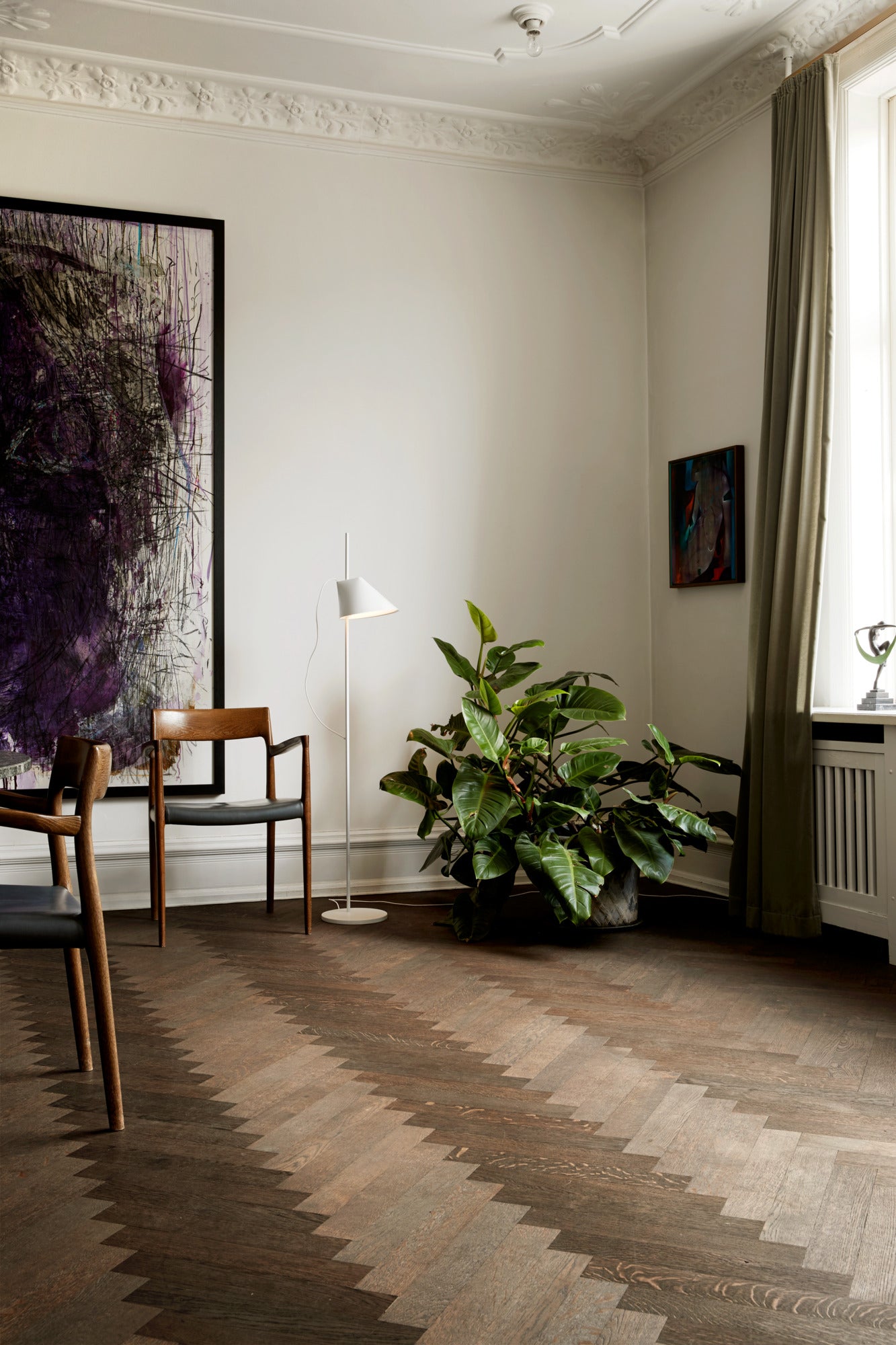 Lampa podłogowa Yuh to nowoczesna interpretacja skandynawskiego wzornictwa, zaprojektowana przez duet GamFratesi dla Louis Poulsen w 2017 roku. Jej minimalistyczna forma oraz możliwość obracania, podnoszenia i opuszczania klosza pozwala na idealne dostosowanie oświetlenia do potrzeb użytkownika. Klosz kieruje światło w dół, zapewniając komfortowe, nieoślepiające oświetlenie, a subtelne otwarcie w jego górnej części tworzy delikatną poświatę w przestrzeni. Lampa podłogowa doskonale sprawdzi się zarówno w salonie, sypialni, jak i biurze, budując przyjemną atmosferę do pracy i relaksu.