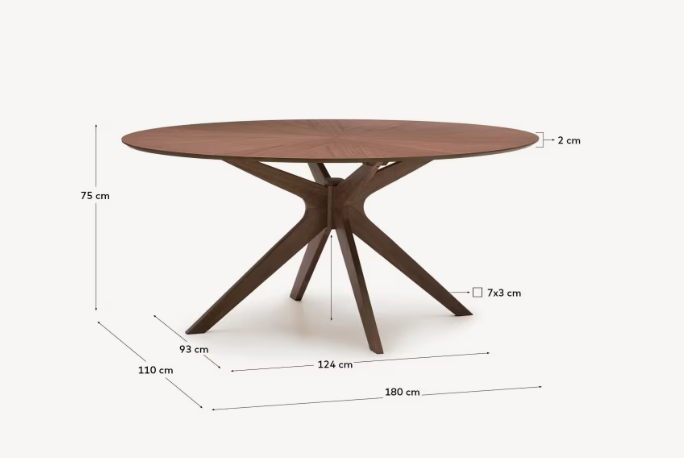 Tisch Onanius ist eine elegante und funktionale Wahl für den Esszimmer, der natürliche Materialien und einzigartiges Design kombiniert. Das runde Oberteil aus natürlichen Nussfurnier verleiht ihm einen einzigartigen Charakter, dank des einzigartigen Musters von Gläsern, die in der Form eines Sterns konvergieren. Beine Tisch, bestehend aus massivem Gummiholz in einem nussigen Finish, sorgen Sie für Haltbarkeit und Stabilität.