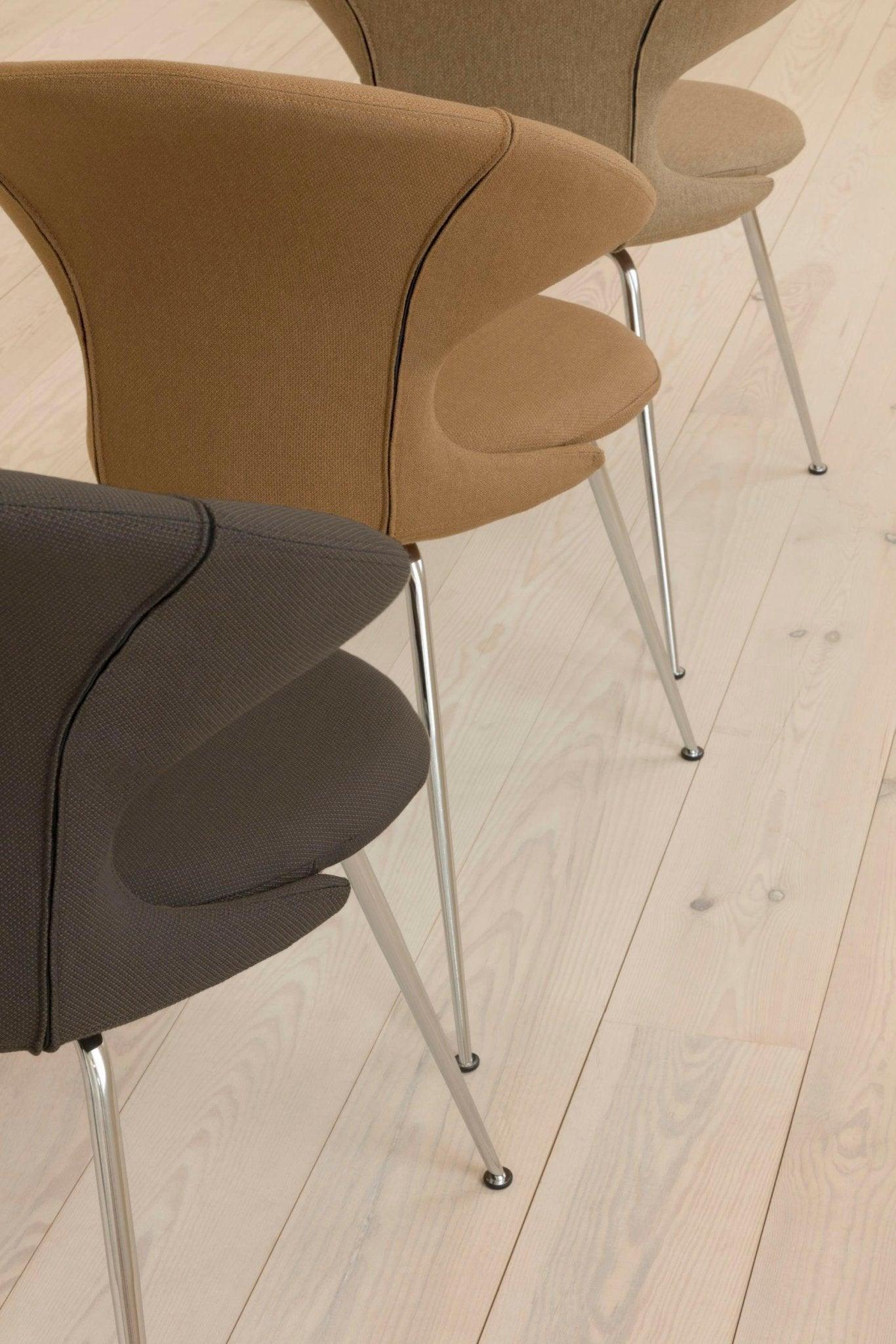 Stuhl Es ist in 17 sorgfältig ausgewählten Farben des Horizons erhältlich, das 100% recycelt ist. Darüber hinaus umfassen Beinoptionen Messing-, Chrom- oder Black -Oberflächen, mit denen Sie den Stuhl zu verschiedenen internen Stilen anpassen können. Diese Kombination aus Ästhetik, Funktionalität und einem ausgewogenen Materialansatz macht die Zeit zu einem einzigartigen und dauerhaften Satz.