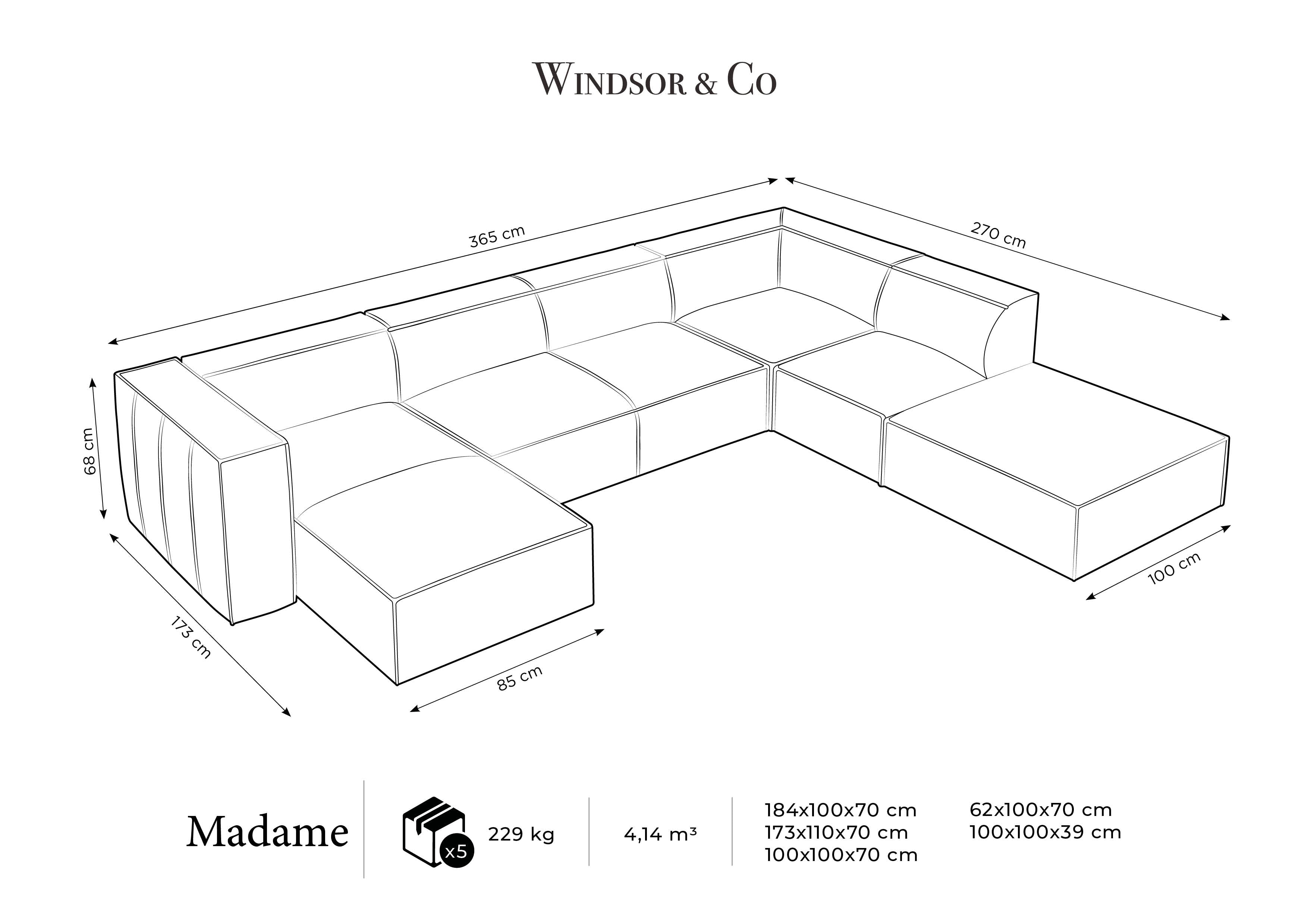 Eine Ecke für sechs Personen Madame mit einem ausgeprägten Charakter und einem eleganten Finish ist eine gute Wahl für ein modernes Wohnzimmer. Der tiefe Sitz eignet sich sowohl für soziale Versammlungen als auch bis zu einem Moment der Entspannung nach einem harten Tag. Sie können bequem in freien Positionen ruhen. Mit einer niedrigen Figur, breiten Armlehnen und Rücken erzeugt es einen gemütlichen Block.