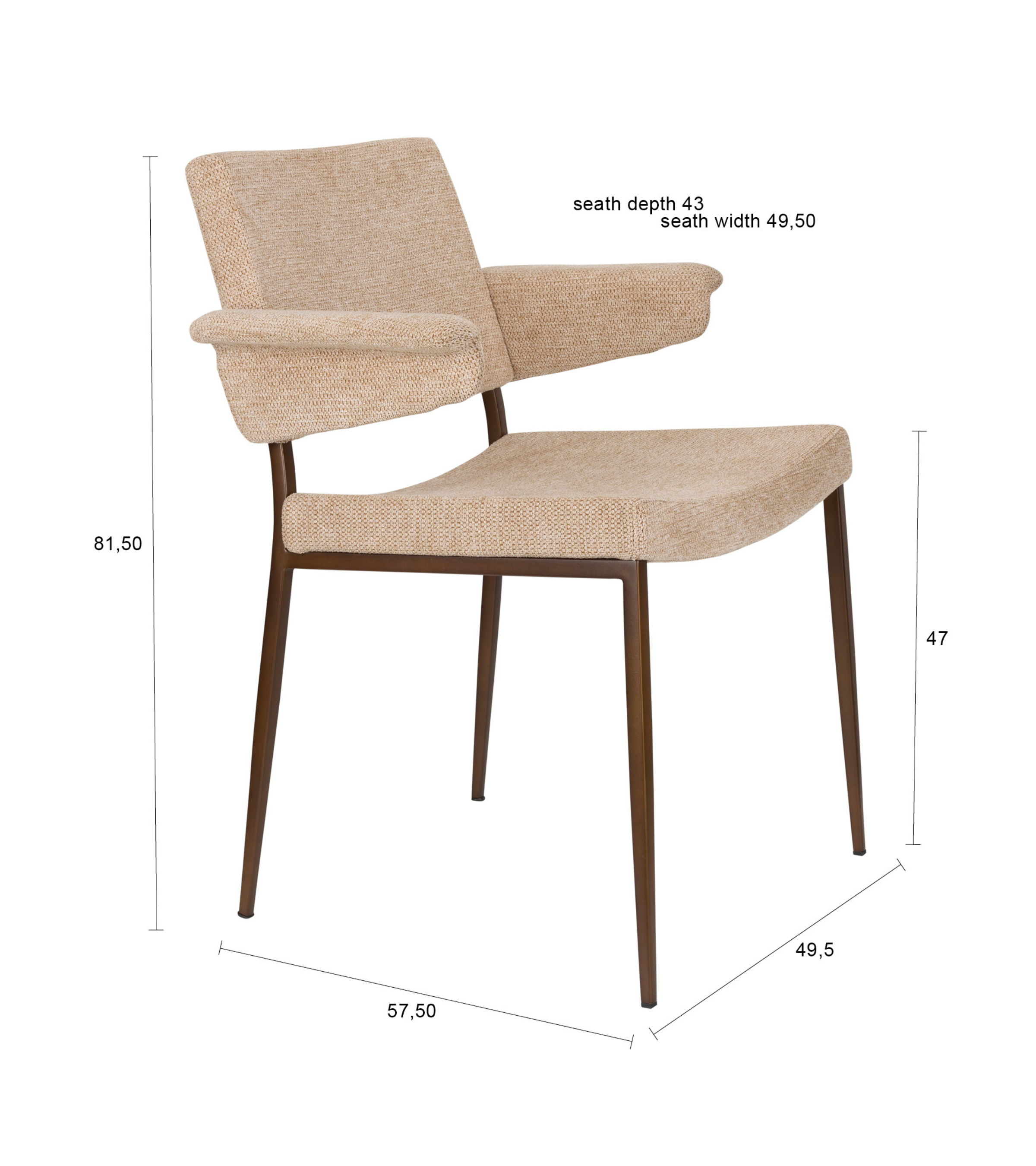 Schaffen Sie eine gemütliche Atmosphäre im Esszimmer mit dem Stuhl Portland, der uns in die stilvollen Innenräume der 50er Jahre versetzt. Schon auf den ersten Blick zieht die Rückenlehne mit sanft geschwungenen Armlehnen, die an Flügel erinnern, die Aufmerksamkeit auf sich. Die sanft geformte Sitzfläche bietet hohen Komfort, selbst bei langen, abendlichen Gesprächen am Tisch. Der grob gewebte, beige Bezug bringt natürliche Wärme und schafft einen beeindruckenden Kontrast zum metallischen Rahmen in braunem, antikem Finish.