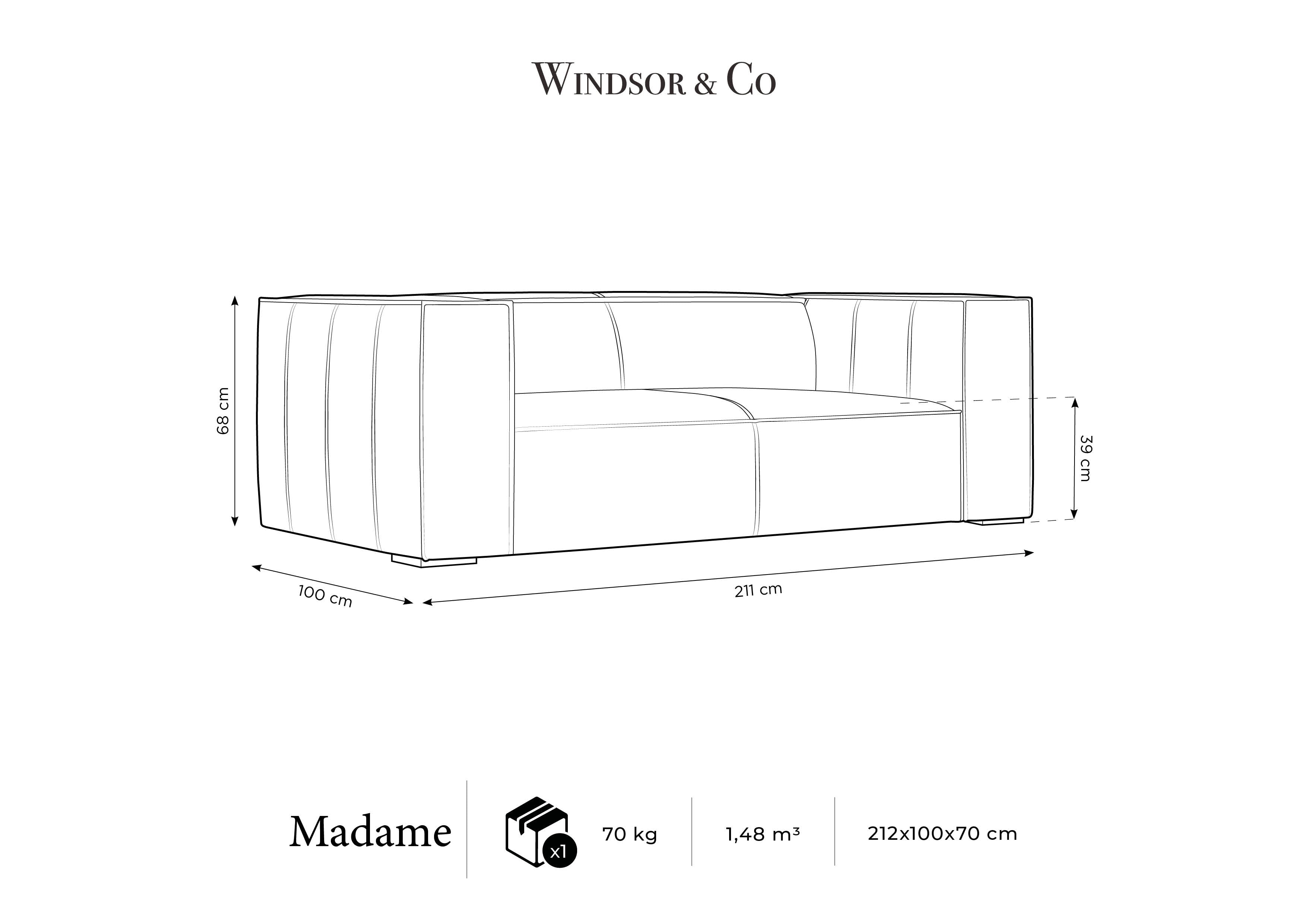 Sofa für zwei Personen Madame mit einem ausgeprägten Charakter und einem eleganten Finish ist eine gute Wahl für ein modernes Wohnzimmer. Der tiefe Sitz eignet sich sowohl für soziale Versammlungen als auch bis zu einem Moment der Entspannung nach einem harten Tag. Sie können bequem in freien Positionen ruhen. Mit einer niedrigen Figur, breiten Armlehnen und Rücken erzeugt es einen gemütlichen Block.