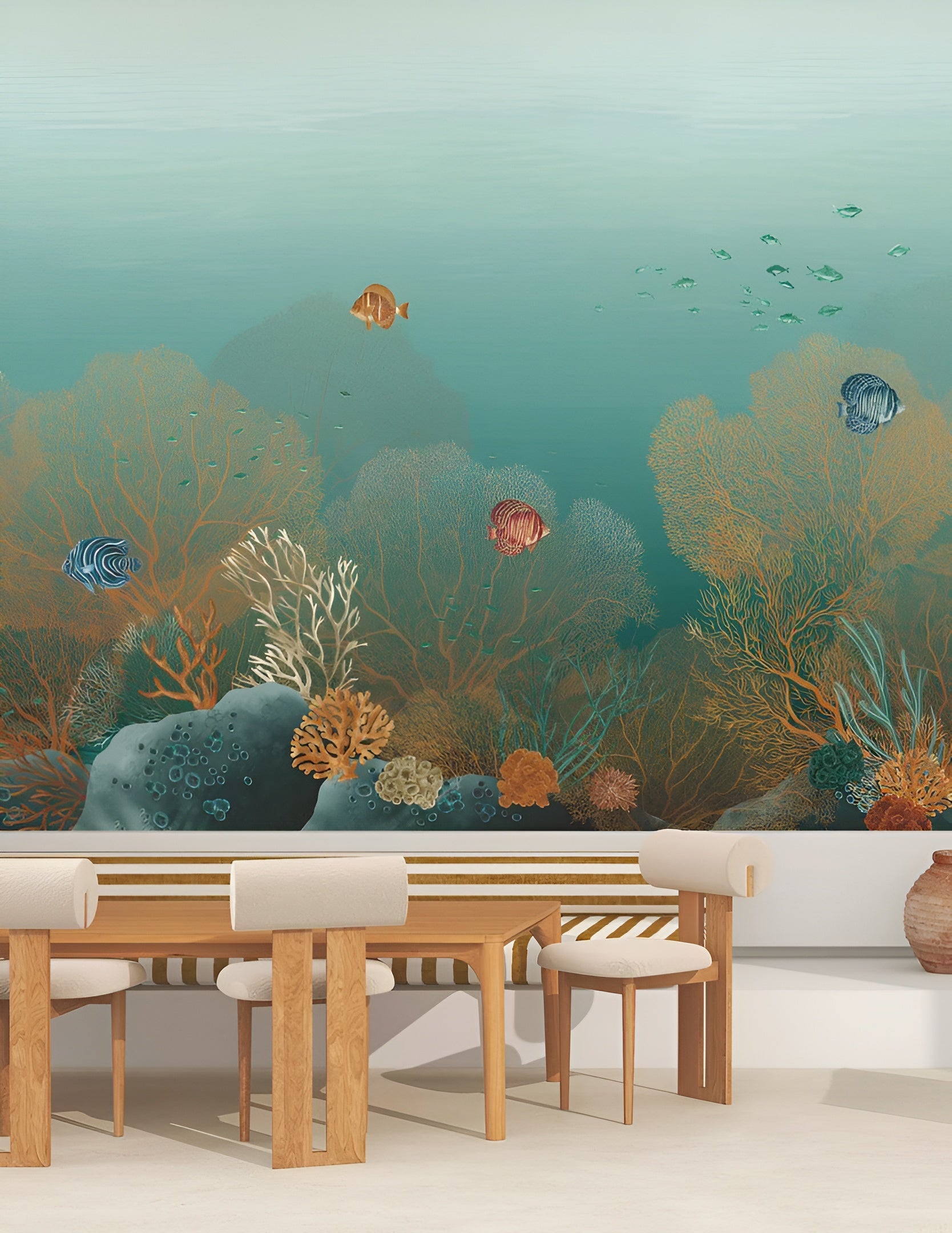 Mural Polynesie ist eine Einladung, in die ruhige, unterwasserwelt von Polynesien einzutauchen. Das Design zeigt kristallklares Wasser, durch das majestätisch Mantas gleiten, während bunte Fische unter den Korallenformen tanzen, als wären sie in einem Unterwasser-Garten. Der Mural schafft im Raum eine Atmosphäre der Harmonie und des Trostes und lenkt den Blick in die Tiefen der maritimen Landschaft. Es ist eine Dekoration, die wie ein Fenster zu einer anderen Welt wirkt – ideal für das Wohnzimmer, das Schlafzimmer, das Arbeitszimmer oder den Wellnessbereich.