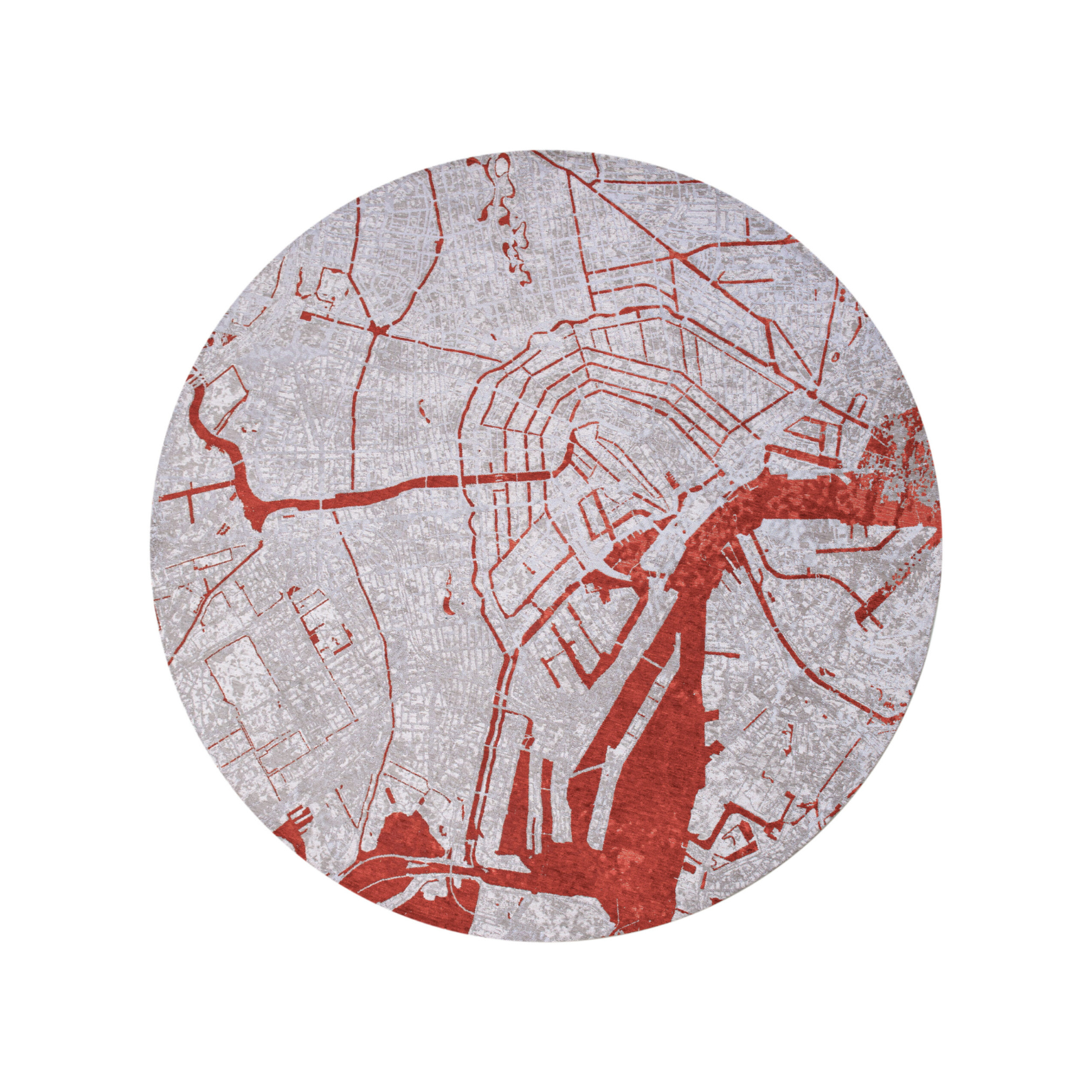 Round gray-red modern carpet Cities Amsterdam Orange Cut Round will certainly delight you with its design. The collection inspired by the bird's eye view views offers a unique pattern that combines mysterious aesthetics with transparency, referring to the mesmerizing atmosphere of old maps.