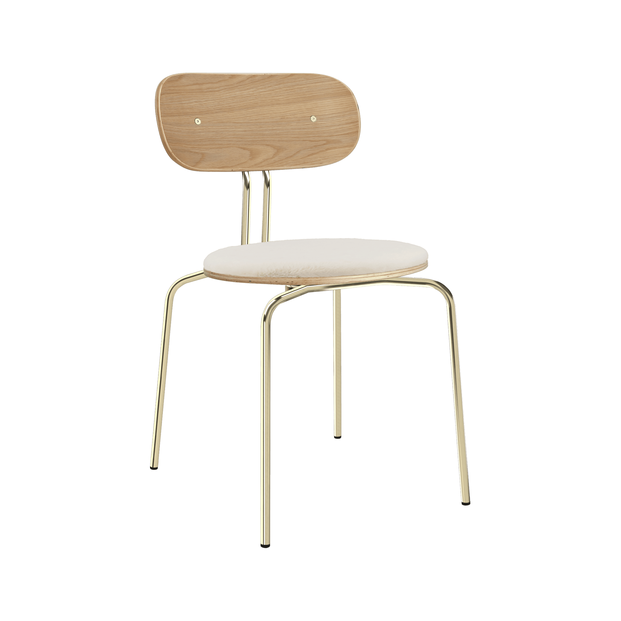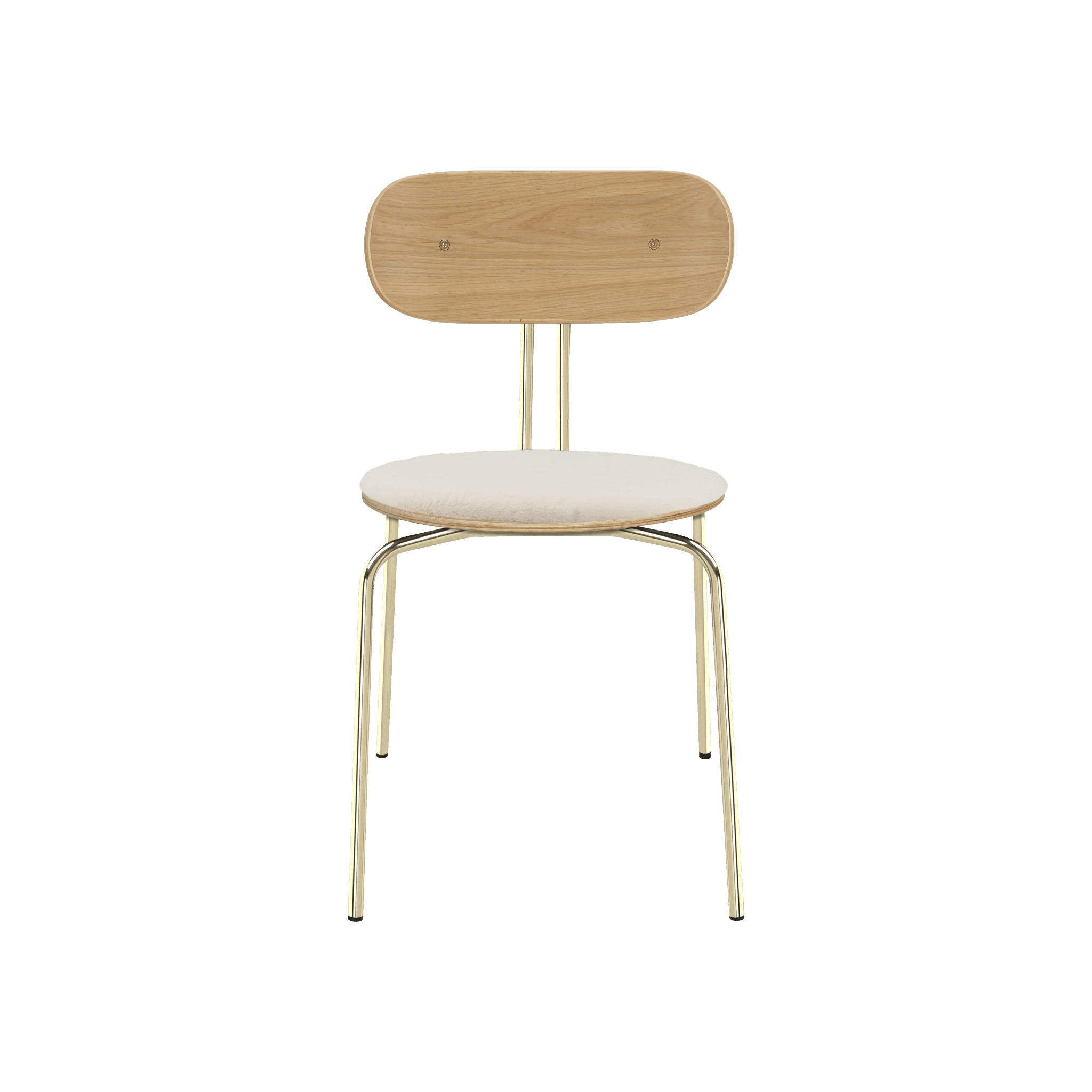 Chair Curious is elegant, light and minimalist furniture, made of oak veneer. It is available with brass or black legs, and the optional seat cushion provides additional comfort. You can choose a pillow from 17 colors of Horizons fabric, made 100% recycled, as well as in a brown or white shade of Teddy Bear fabric.