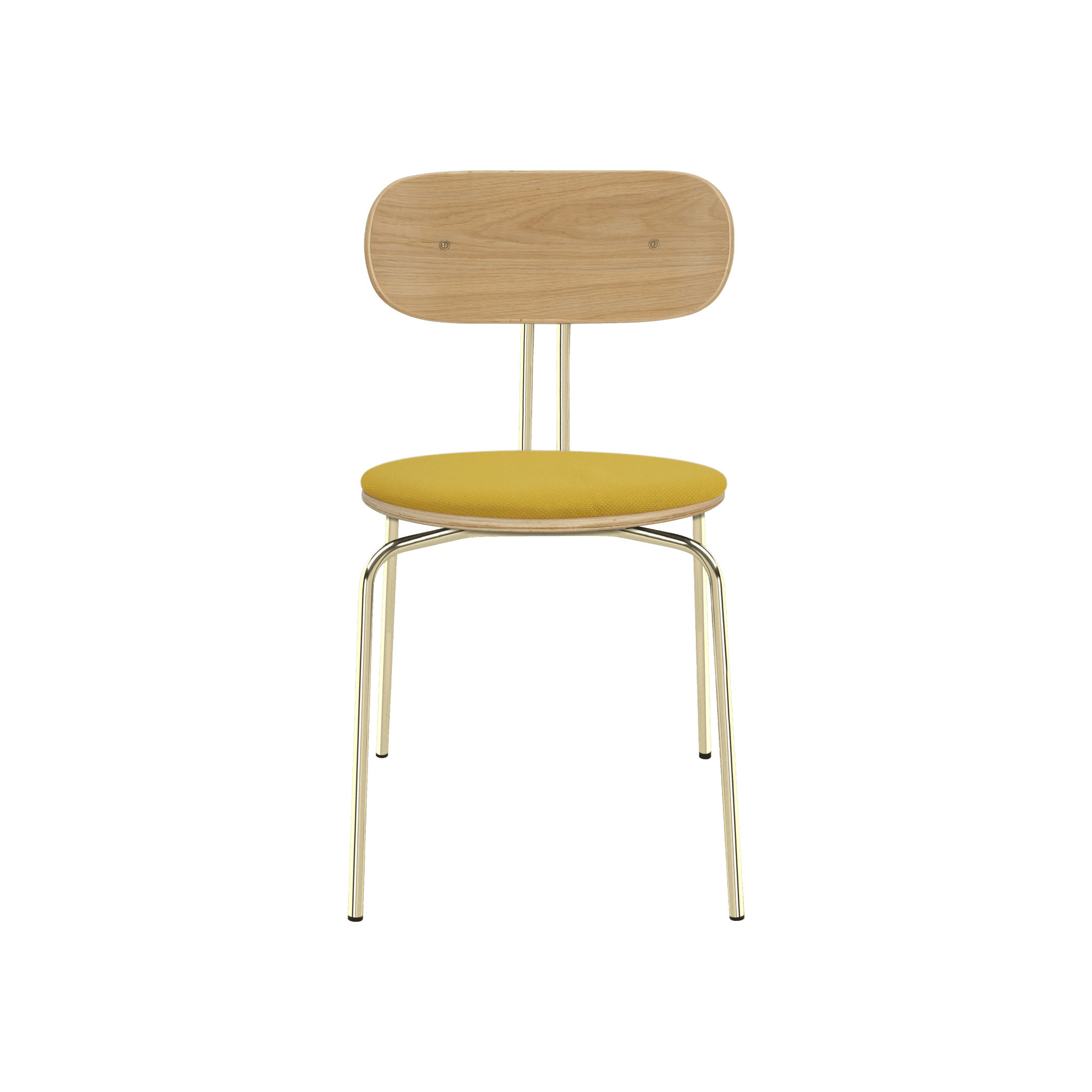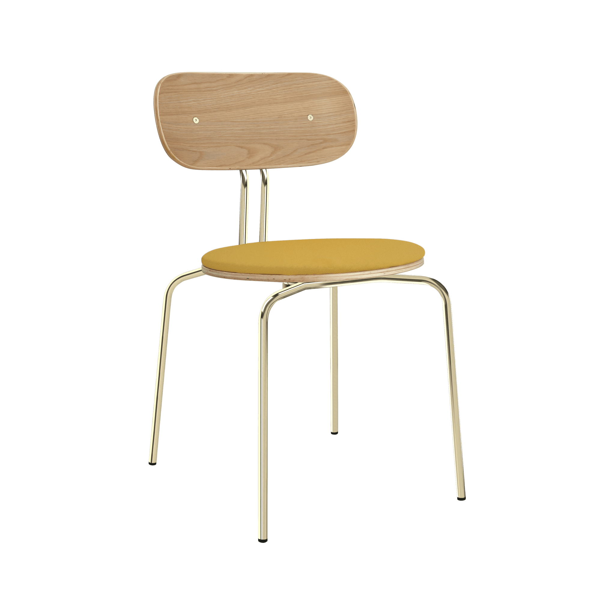 Chair Curious is elegant, light and minimalist furniture, made of oak veneer. It is available with brass or black legs, and the optional seat cushion provides additional comfort. You can choose a pillow from 17 colors of Horizons fabric, made 100% recycled, as well as in a brown or white shade of Teddy Bear fabric.