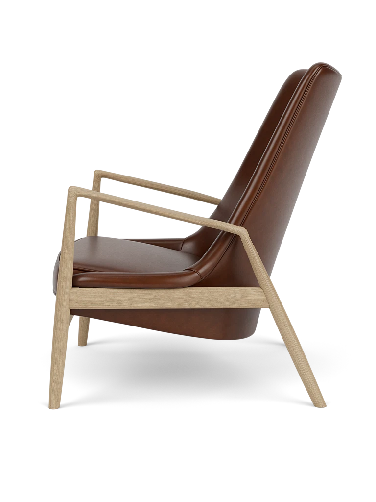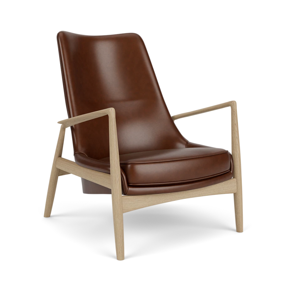 Fotel z wysokim oparciem THE SEAL brązowa skóra z dębową podstawą