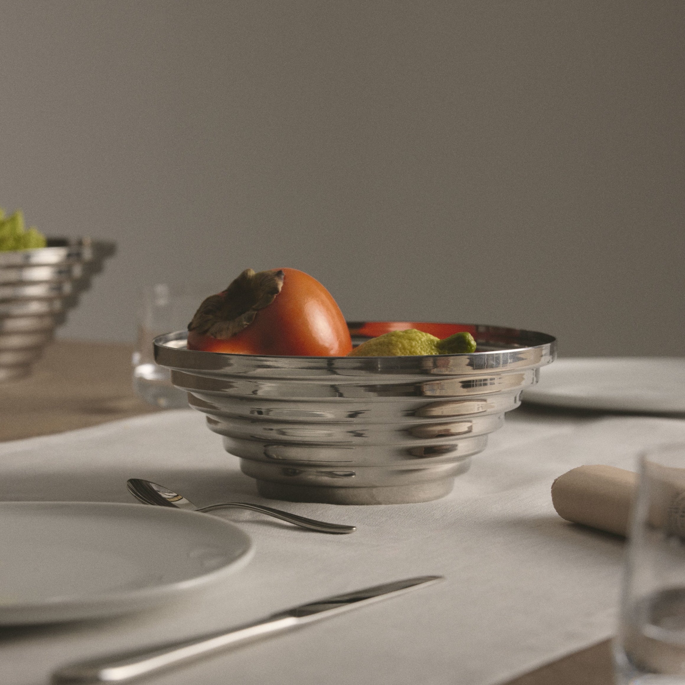 The basket is produced in diameters of 20 cm and 25 cm, and its masterful cold-forming of steel sheet showcases Alessi's history and expertise in steel processing.