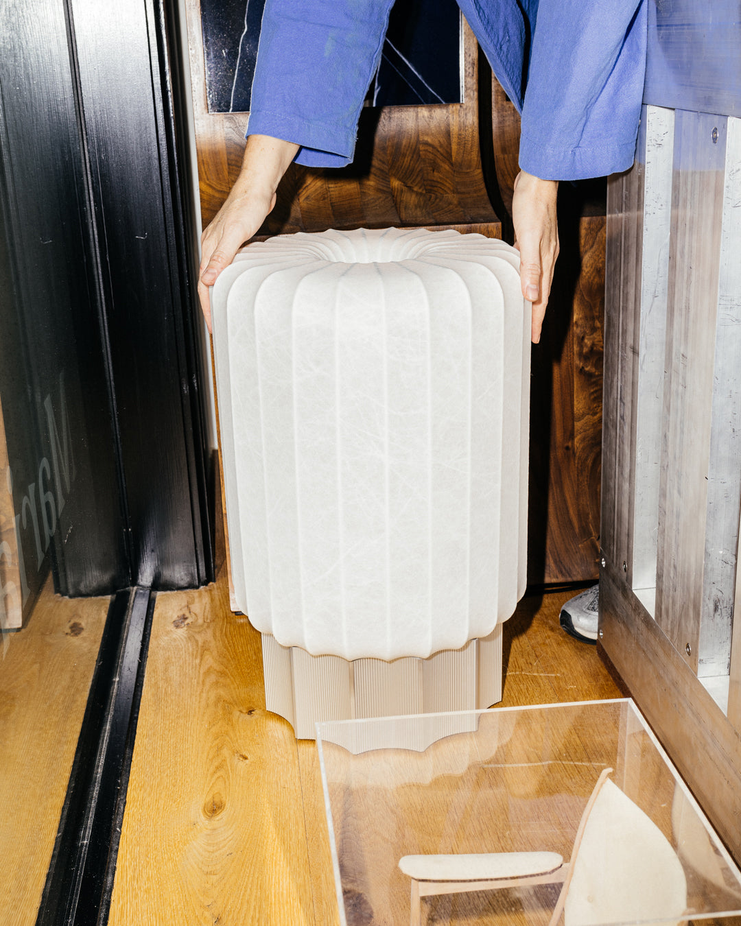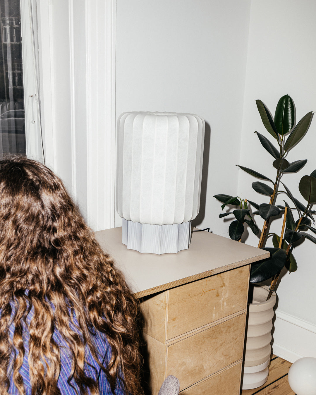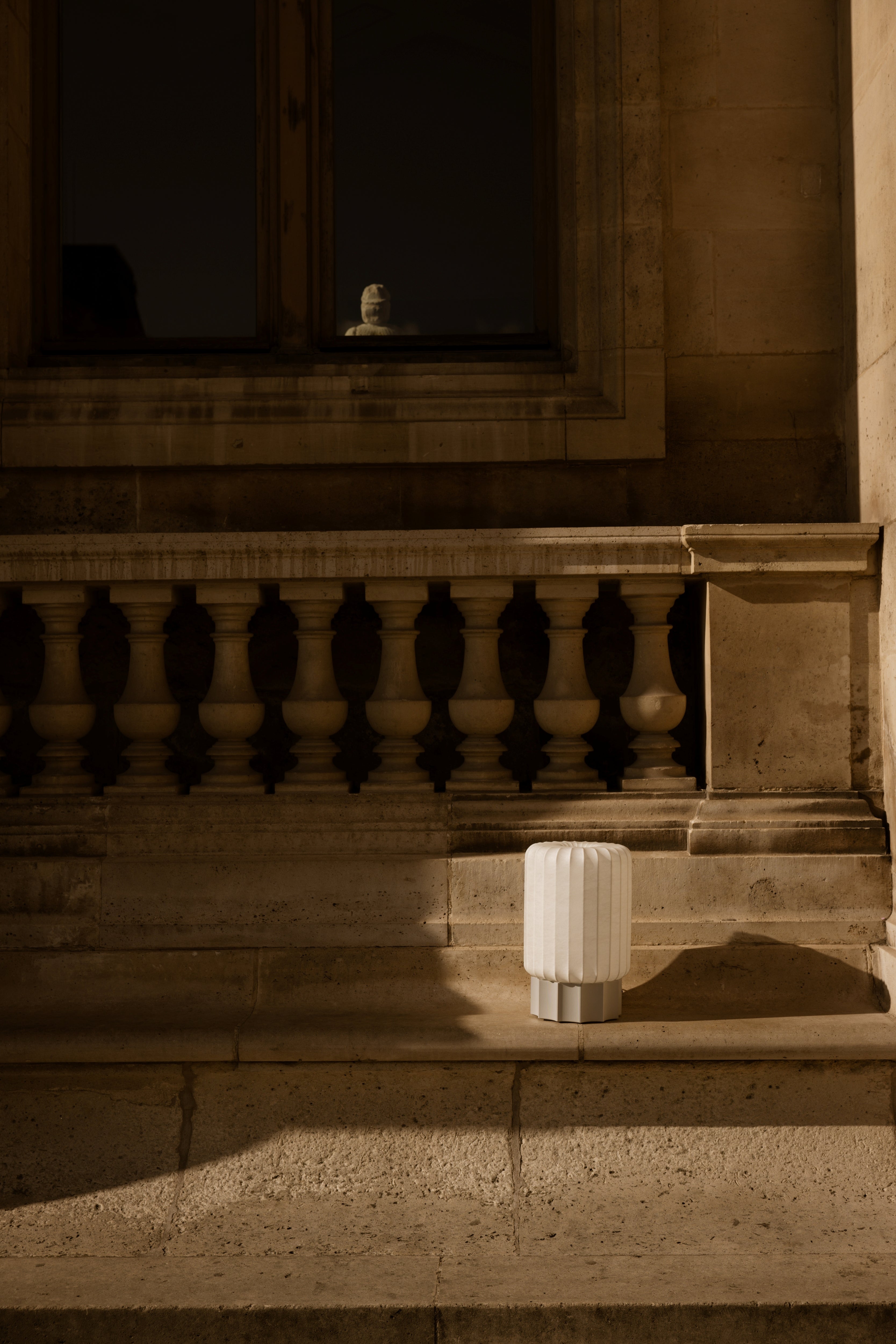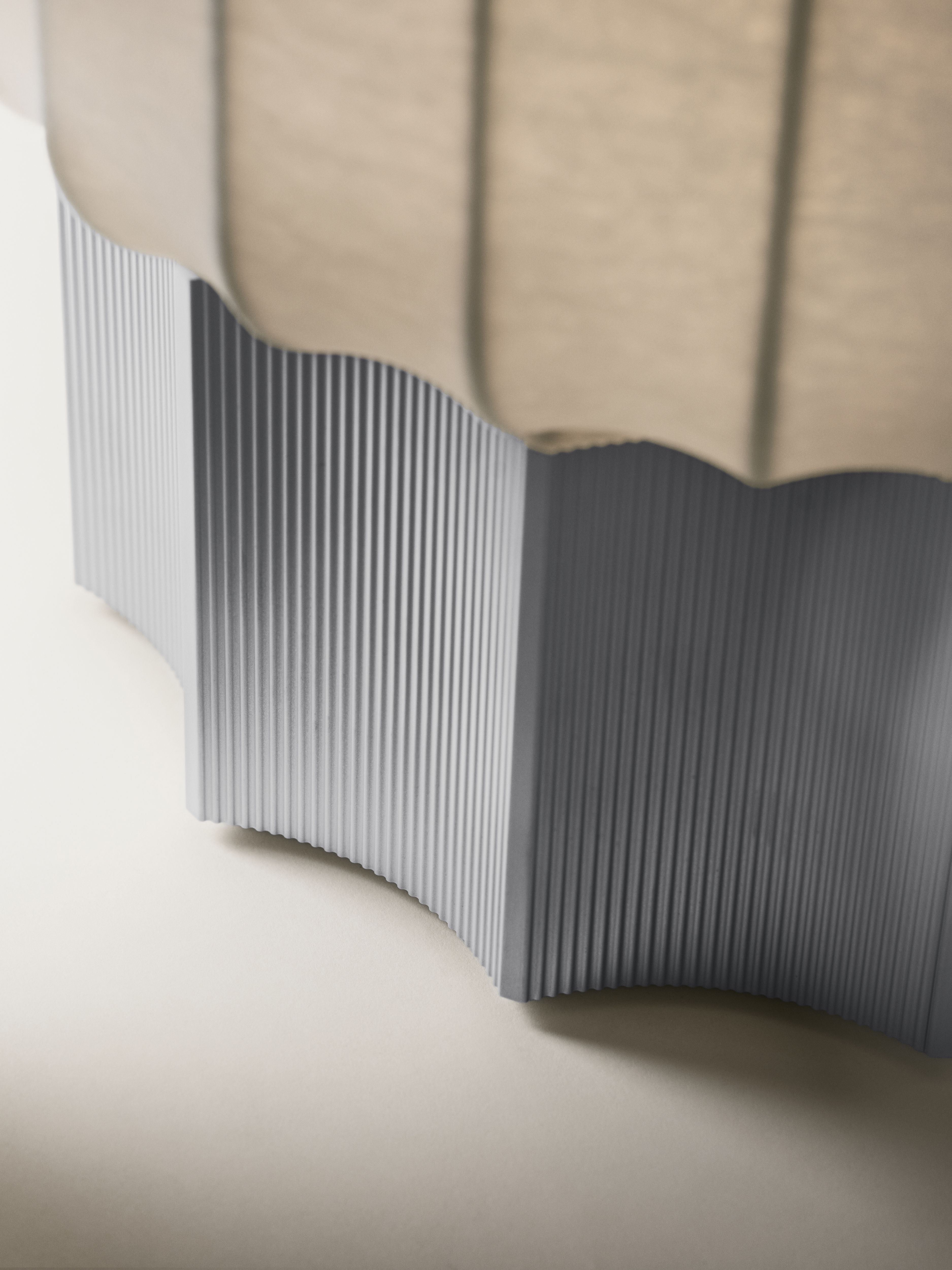 The Meter floor lamp captivates with its architectural form and subtle details. Its soft, semi-transparent design references classic cocoon fabric fixtures, creating a cozy and atmospheric light. The wavy, cylindrical base contrasts with the delicate shade, showcasing a thoughtful blend of rawness and lightness. The form of the lamp is based on a rhythmic play of vertical lines and soft curves, giving the whole piece a dynamic, sculptural character.