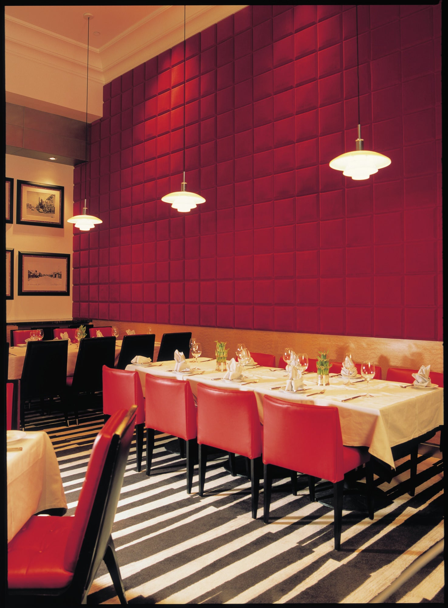 Hand-blown shades made of three-layer opal glass provide soft, pleasant, and even lighting. The upper surface of the shades is glossy, while the lower is matte, creating a subtle light effect. The pendant lamp PH 4½-4 is perfect above a dining table, in a living room, or in an elegant commercial space. The chrome suspension and purple aluminum anti-glare disc add character and a unique style.
