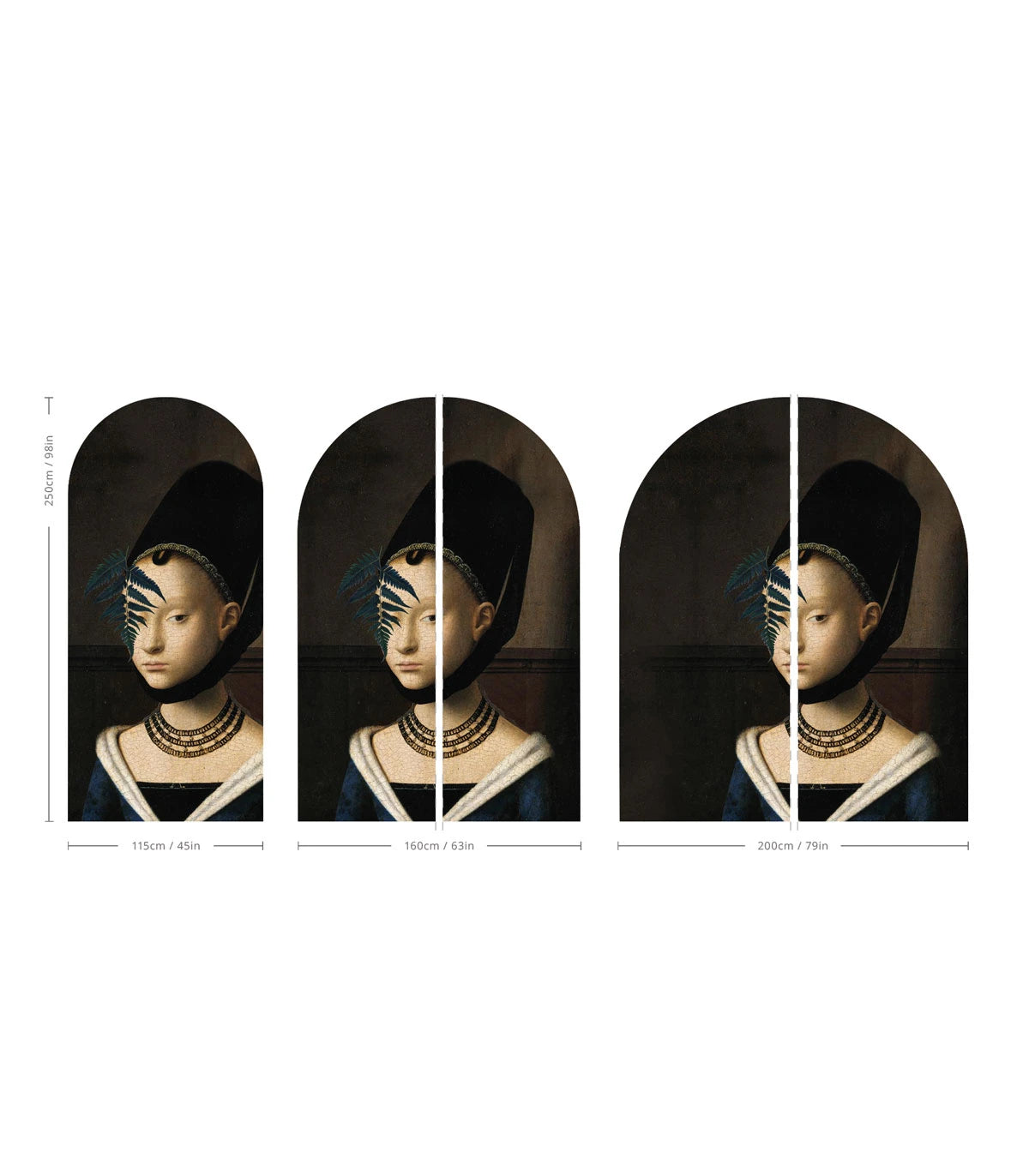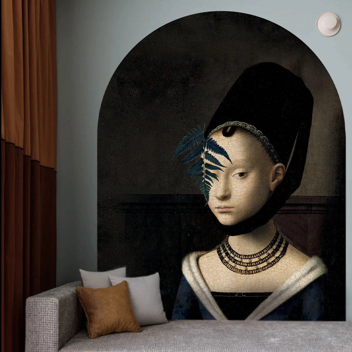 Arch-shaped mural Lady Fern is a wall decoration that blends classic painting with a touch of surreal symbolism. The portrait of a woman enriched with the motif of a fern leaf creates an intriguing, multi-layered composition that immediately captures the eye. Subtle color transitions and elegant styling give the wallpaper a unique, refined character, perfectly fitting into both modern and classic arrangements.