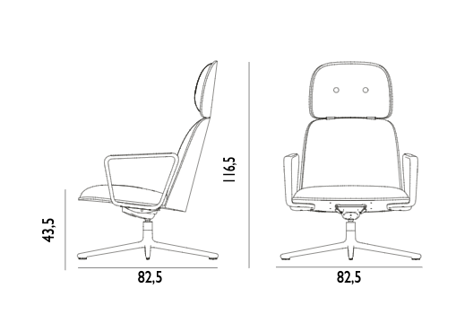 The PAD series includes Armchair with a high and low back and a matching footrest. There are three types of bases to choose from: static steel frame in black or gray, rotary base in black or polished aluminum and a base with trade and tilt function, also in black or polished aluminum for greater mobility. Each of the options combine with a backrest of natural oak or black oak and offers three different quality upholstery in a wide range of shades.