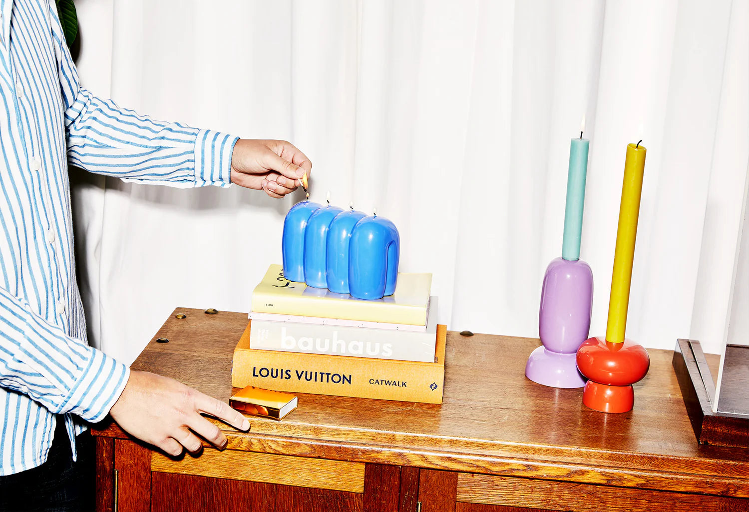 Made of glazed stoneware, the candle holder impresses with its vivid finish and unique shape. Each piece has its own individual character and works wonderfully as a decorative accent on a table, shelf, or dresser. This is a proposal for those who appreciate unconventional accessories and want to add a touch of color and energy to their space.