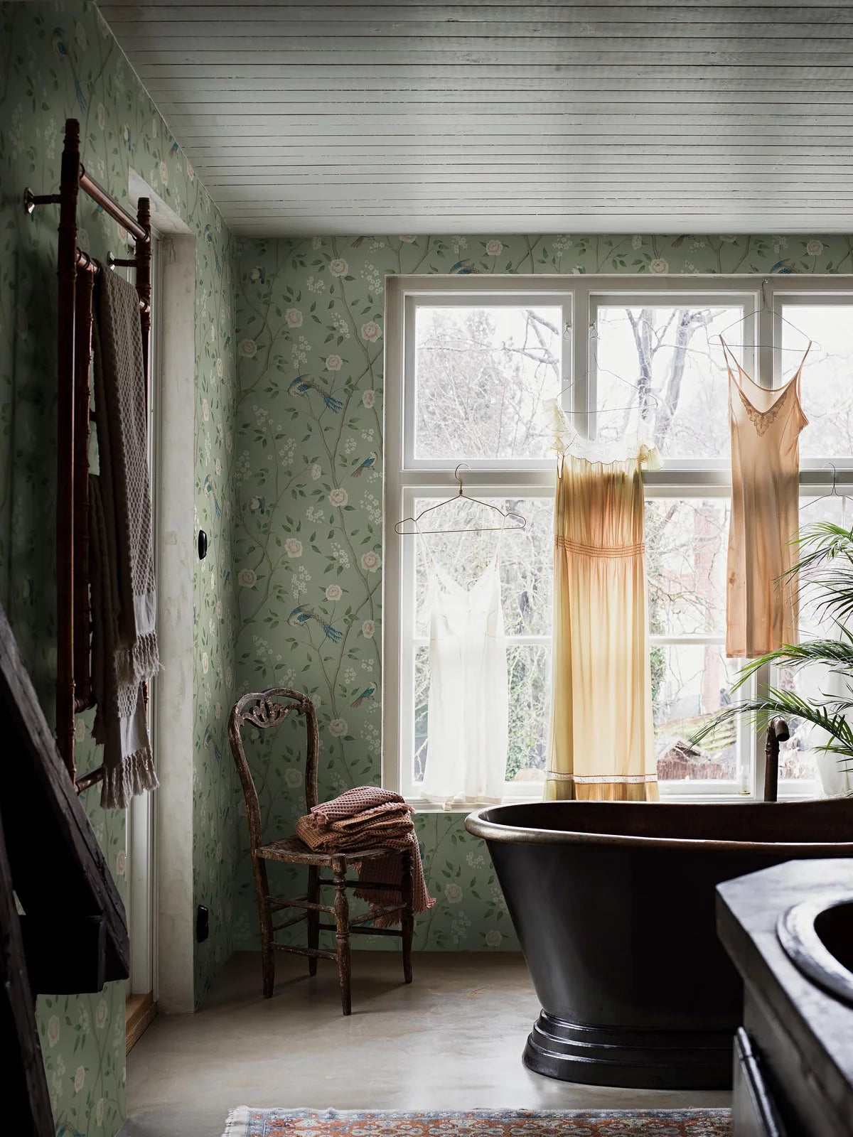 Wallpaper Paradise Birds is perfect for a bedroom or bathroom, where it will create an atmosphere of tranquility, romance, and luxury. The floral and bird motifs bring harmony inspired by nature into the interior, while simultaneously highlighting an elegant and sophisticated style of arrangement.