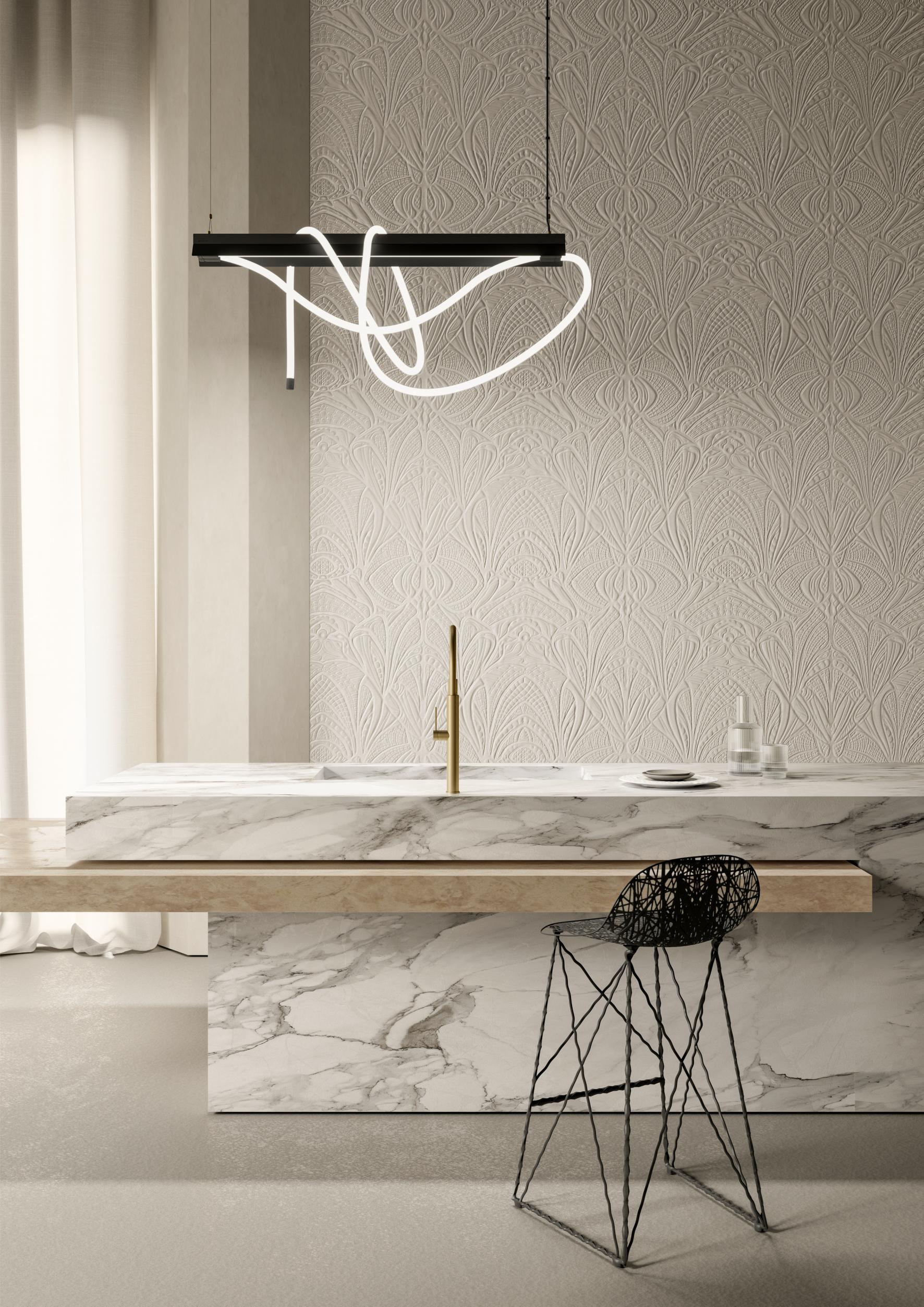 Lacy Longlegs Wallpaper is a unique wall decoration with a three-dimensional character that captivates with its original texture and vivid depth. Inspired by intricate spider webs, delicate leaves, and the forms of Gothic arches, the wallpaper creates the effect of a soft, spatial sculpture on the wall. The use of bouclé fabric adds a subtle relief to the surface, highlighting the elegant and luxurious character of the interior.