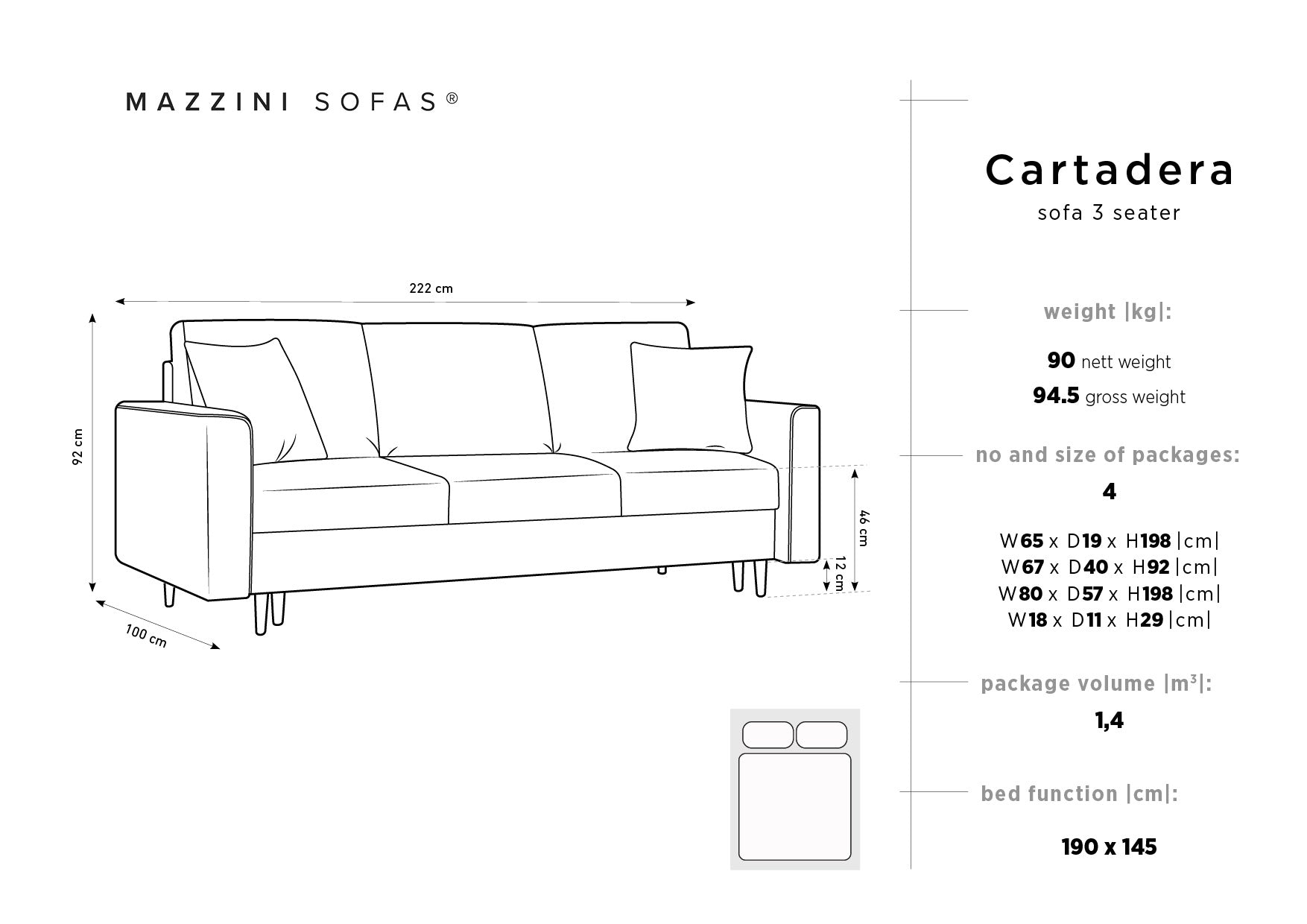 Sofa folding for three people Cartader It is distinguished by an elegant shape and stylish finish, which will introduce a little coziness to the interior. Upholstery characterizes High abrasion resistance and a slightly shiny, velvet structure. Large Pillows and handy armrests will ensure adequate comfort during the daily use of the sofa. Chrome legs are a modern accent and give the whole form lightness.